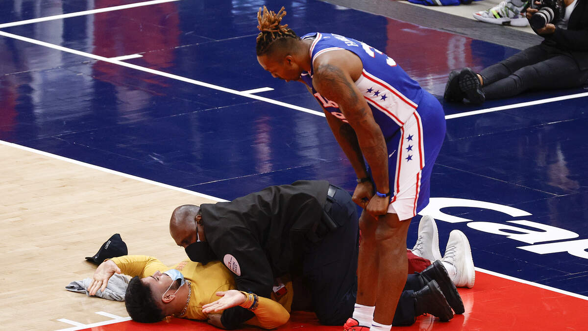 Last night in the third quarter of Game 4 between the 76ers and the Wizards, a fan attempted to charge the court and hit the backboard. Security got him, and several people tweeted out the incident from different angles.