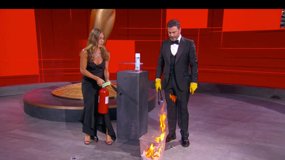 The 2020 Emmys went virtual last night; one of the most talked about moments happened on stage! Jennifer Aniston joined Jimmy Kimmel to announce the award for "lead actress in a comedy series." Kimmel wanting to make sure there were no covid germs on the Emmy envelope, soaked it in Lysol. He then threw it in the trash and set it on fire. It was funny until the fire continued to reignite after being put out. Turns out, Jennifer Aniston is not only an amazing actress.... she's also pretty good out putting out fires too! Watch the video of Jennifer Aniston saving the day!
