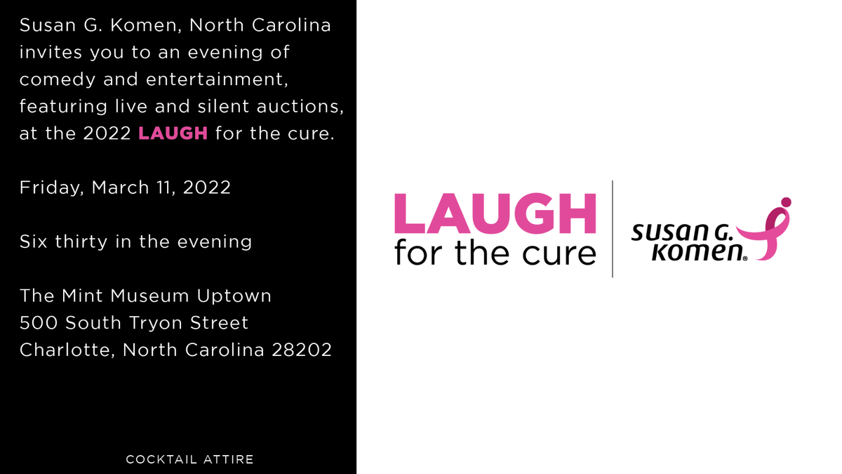 Susan G. Komen, North Carolina invites you to an evening of comedy and entertaiment. Featuring live and silent auctions at the 2022 Laugh For The Cure Friday March 11th, 2022 at The Mint Museum Uptown *Cocktail Attire