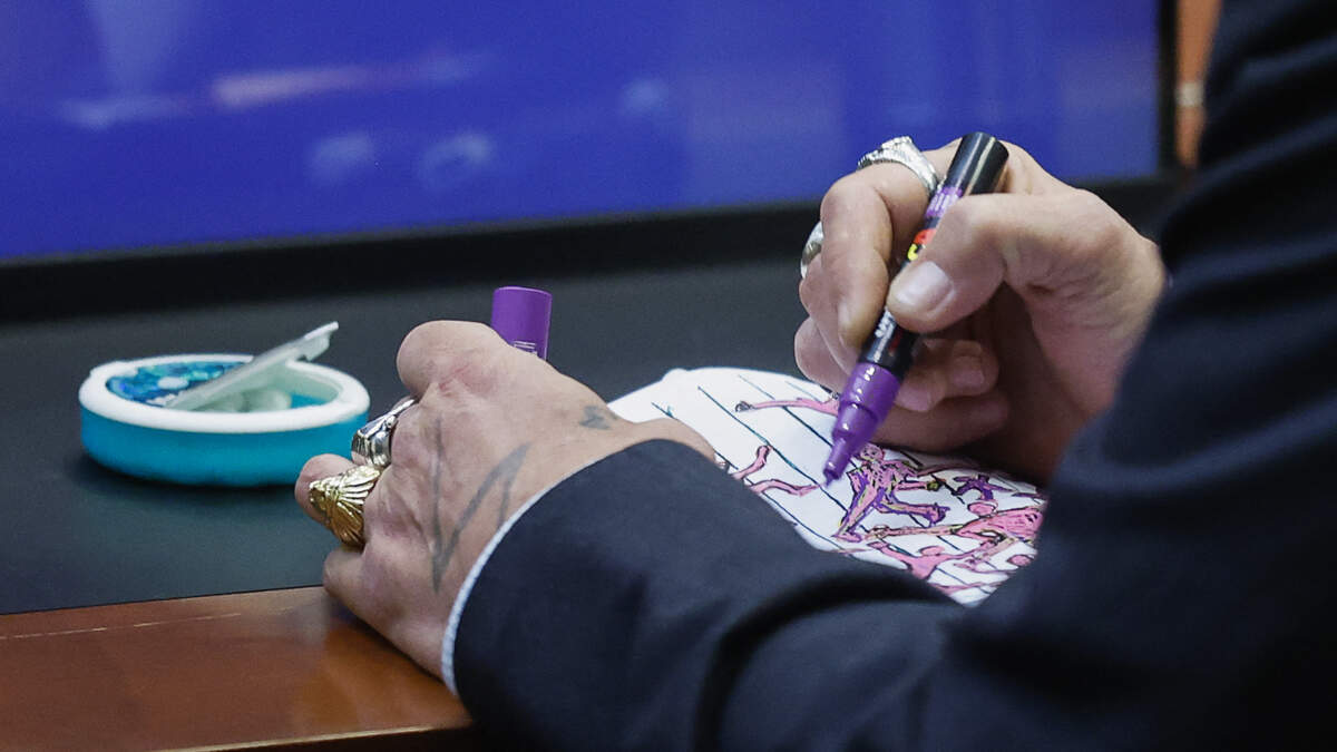 How do you pass time during long days at court? By doodling.... if you're Johnny Depp. Depp is suing his ex wife Amber Heard for defamation after she wrote an article claiming to be a survivor of domestic violence. Recent pictures and video have gone viral showing Depp taking up drawing to pass his time during those long court days. You can also see more of his artwork HERE in a TikTok where Depp is caught showing off one of his drawing masterpieces to his lawyer.